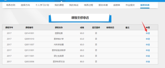 重修补修报名时间为7月13日--7月19日,请需要重修的同学根据2020-2021学年第一学期研究生教学任务(附件1),登录教务管理系统,提交重修申请,操作步骤:培养---重修申请---点击课程后的申请按钮即可完成该门课程的重修申请。