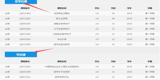 (2)培养方向确定后,系统显示出专业的课程设置详细信息,分学位课和非学位课,如图:
