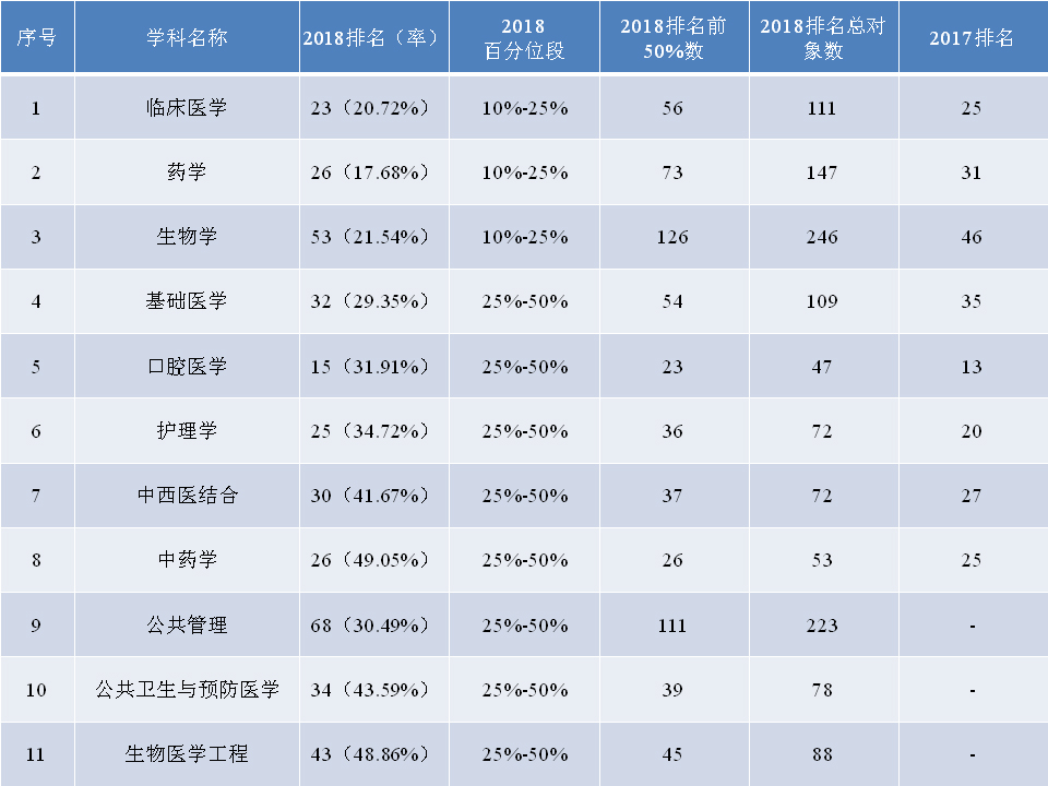 11月1日,上海软科正式发布2018“中国最好学科排名”。性吧 临床医学、药学、生物学、基础医学、口腔医学、护理学、中西医结合、中药学、生物医学工程、公共卫生与预防医学、公共管理等11个学科上榜,上榜学科数较上一年度增加3个,临床医学、药学和基础医学等学科排名均有明显提升。