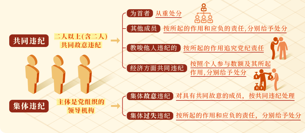 需要留意不能以“集体领导”“集体负责”“集体研究”等为借口,不追究集体作出违纪决定或者集体实施违纪行为的领导成员责任。但是,以下两种情形不属于集体违纪:一是个人违反民主集中制的原则,擅自作出错误决定,不能追究集体责任,只能按照个人违纪处理。二是对于在领导机构作出错误决定或者实施错误行为时,没有参与或者表示反对的,不视为集体违纪人员。