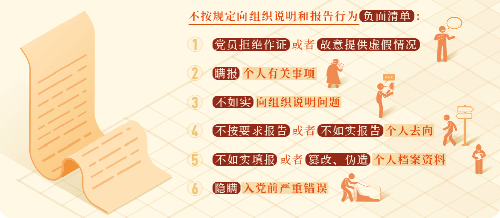 《中国共产党纪律处分条例》第八十条、八十一条,对不按规定向组织说明和报告行为作出了处分规定,主要包括6类: