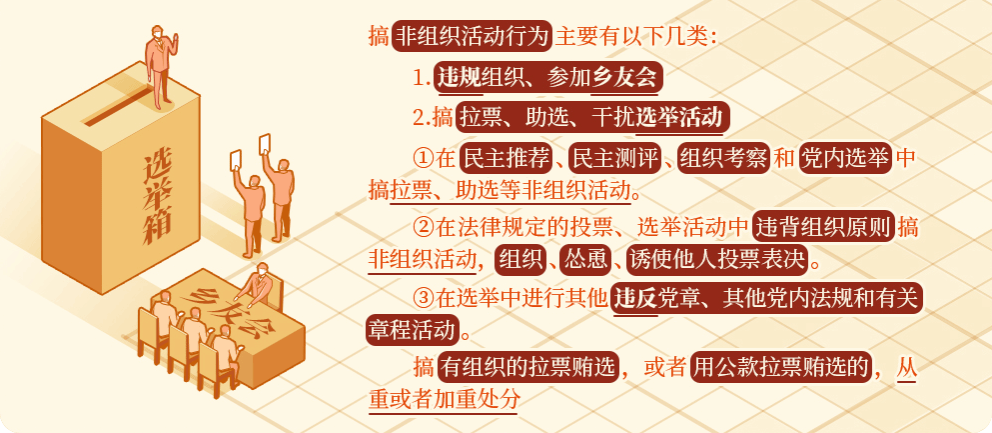 党内选举是党内政治生活的重要组成部分。《关于新形势下党内政治生活的若干准则》规定,党内选举必须体现选举人意志,坚决防止和查处拉票贿选等行为。在选举活动中搞非组织活动,干扰选举人表达选举意愿,侵犯其他被选举人权益,侵蚀党内政治文化,在党员群众中造成不良影响,对这类违反组织纪律的行为必须予以坚决惩治。