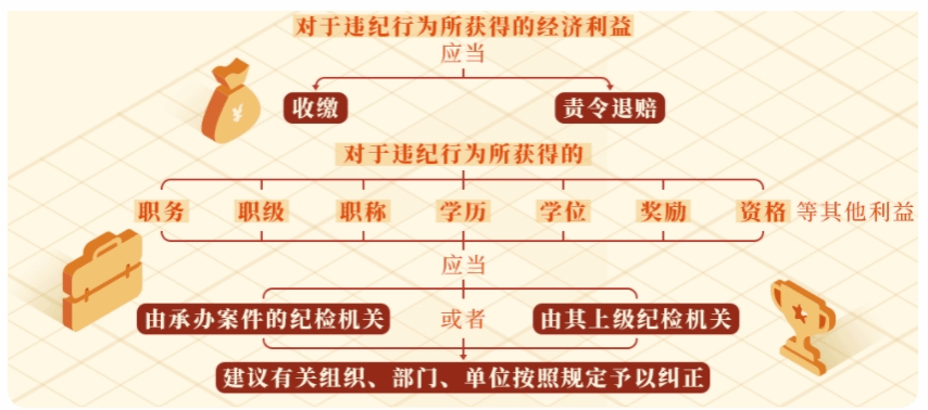 对于违纪行为所获得的职务、职级、职称、学历、学位、奖励、资格等其他利益,应当由承办案件的纪检机关或者由其上级纪检机关建议有关组织、部门、单位按照规定予以纠正。