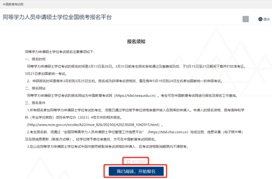 4.请认真阅读报名须知,点击“我已阅读,开始报名”按钮。填写预留手机号。注意:预留手机号是“申请入册时”的手机号(与同等学力信息工作平台一致)。