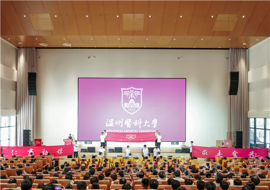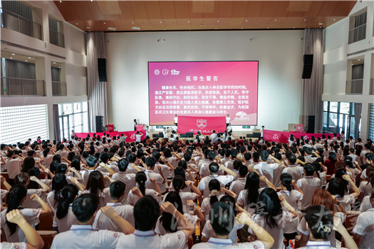 现场,参会领导和老师为新生代表佩戴校徽,新生之间互相佩戴校徽。温医大校旗校训在新生中传递。随后,举行全体新生“医学生誓言”宣誓仪式。