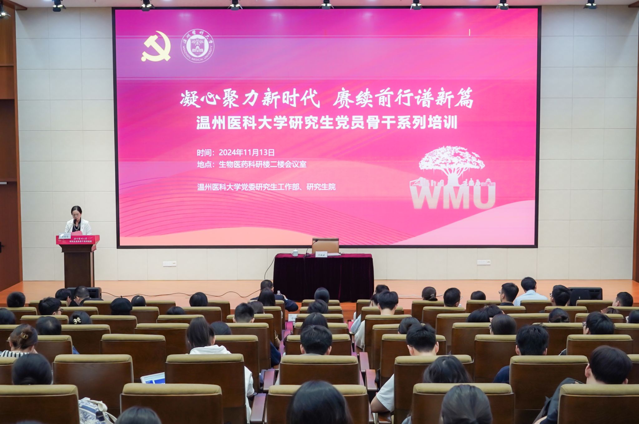 为进一步聚焦“双一流”建设战略目标,紧紧围绕学校党建引领高质量发展要求,切实推进研究生教育高质量发展,2024年11月13日“凝心聚力新时代 赓续前行谱新篇”性吧 研究生党员骨干系列培训在茶山校区生物医药科研楼二楼报告厅举行,校党委副书记章成斌出席会议并作专题报告,党委研究生工作部、研究生院全体教职工,全校200余名研究生党员骨干参加。研究生院党委书记郑曼曼主持会议。