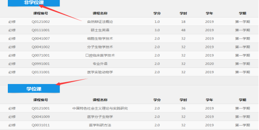 (2)培养方向确定后,系统显示出专业的课程设置详细信息,分学位课和非学位课,如图:
