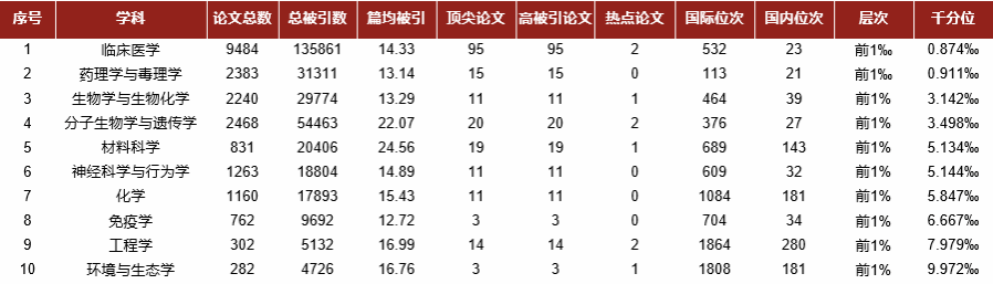 截至目前,性吧 10个学科进入ESI全球排名前1%,其中药理学与毒理学2个学科进入前1‰,综合排名在全球8917个上榜机构中位列735,国内排名第70位,位居省属高校第二,独立设置医科大学第五。临床医学进入ESI全球排名前0.874‰,药理学与毒理学进入ESI全球排名前0.911‰,其他学科的排名均有显著提升。