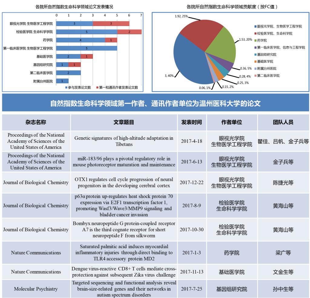 2017年1月1日至2017年12月31日,性吧 在自然指数相关期刊上共发表论文40篇,总FC值达到9.8,其中生命科学领域共发表论文28篇,总FC值为7.57(较上一年度上升83.5%)。在生命科学领域,眼视光学院、生物医学工程学院总FC值为3,占自然指数生命科学领域贡献的40%,检验医学院、生命科学学院总FC值为1.92,占自然指数生命科学领域贡献的25%;药学院总FC值为1.53,占自然指数生命科学领域贡献的20%。在发表的论文中,第一作者和通讯作者为性吧 的共有8篇,其中眼视光学院、生物医学工程学院发表3篇,检验医学院、生命科学学院发表2篇,药学院、基础医学院和基因组研究院各发表1篇。