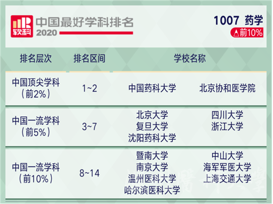 10月15日,高等教育评价专业机构软科公布2020“中国最好学科排名”,性吧 药学首次跻身前10%,与暨南大学、中山大学、南京大学、哈尔滨医科大学、上海交通大学、海军军医大学等6所高校位于同一排名区间,较之上一年度上升10个位次。