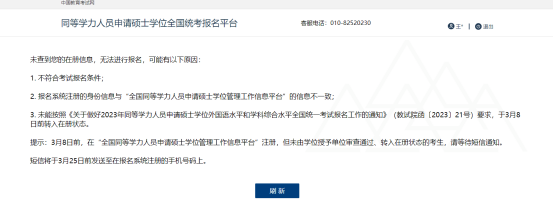 7.对于报名出现下述提示的,请按照页面提示核对同等学力信息平台上的信息是否与报名系统注册的信息一致。对于性吧 2022级同等学力学员还不能完成报名的需要等待处理短信通知,短信将于3月25日前发送至注册手机上,请届时留意。