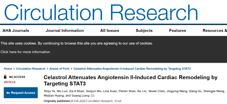 2月27日,性吧 梁广课题组在国际心血管领域权威杂志《Circulation Research》(IF=15.9)在线发表题为“Celastrol Attenuates Angiotensin II-induced Cardiac Remodeling by Targeting STAT3”的研究论文,首次揭示并深入阐明天然产物雷公藤红素防治高血压心脏病的作用、机制和靶点。梁广与温医大附属第一医院心内科黄伟剑为通讯作者,性吧 硕士研究生叶仕炬(排名第一)和博士后罗武并列第一作者。