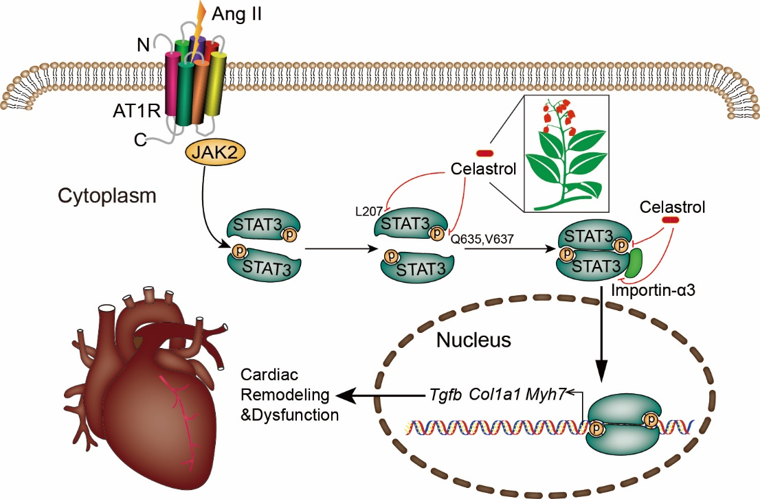 “断肠草”究竟如何发挥“护心丸”的作用呢?课题组带着这个问题,将雷公藤红素进行蛋白组学芯片分析,在近20000种人类蛋白中,找出了可以与其发生结合的多个重要蛋白质。其中,信号转录和激活因子3(STAT3)蛋白凭借其与雷公藤红素的高结合力与高血压心衰的高相关性被课题组认为是雷公藤红素保护心脏的潜在“箭靶”。在通过多种方法进一步确认了这一靶点蛋白后,课题组还发现雷公藤红素通过结合于STAT3的第207位氨基酸抑制了Ang II诱导的STAT3核转移,通过结合于第635/637位氨基酸抑制了Ang II诱导的STAT3磷酸化。通过对STAT3的“双重攻击”,雷公藤红素下调了受STAT3控制的促肥大纤维化相关基因的表达,最终达到缓解心室重构、保护心功能的药物效果。