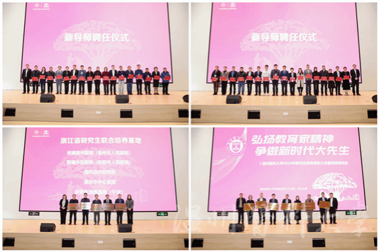 副校长金胜威等领导为教育部主题案例获奖教师、省级优秀学位论文指导教师、校级教学成果奖等研究生教育改革先进个人,以及省级研究生联合培养单位、校级研究生教育满意度先进单位等颁奖,并为新导师颁发聘任证书。博士生导师代表赵斐带领全体教师庄严宣誓。