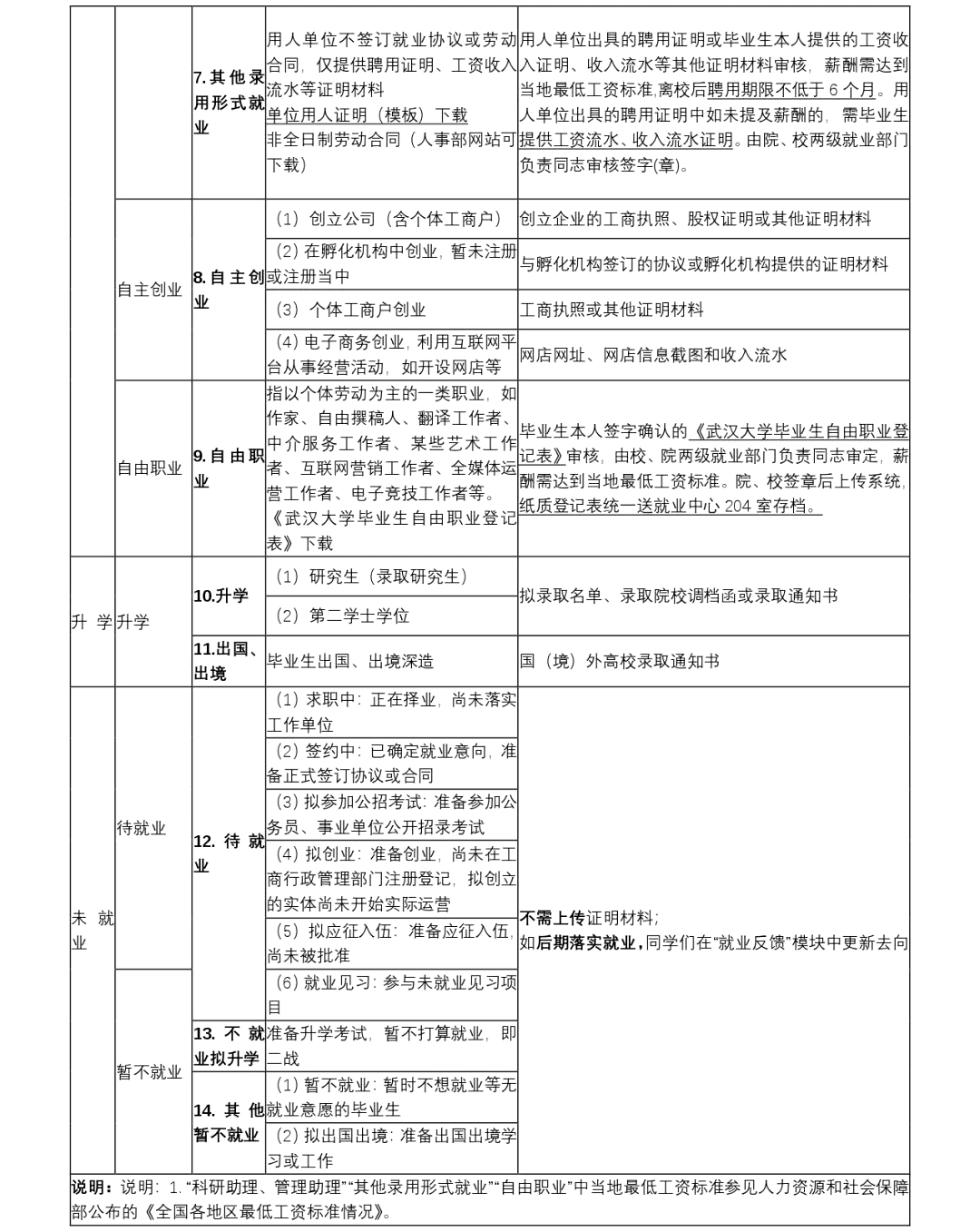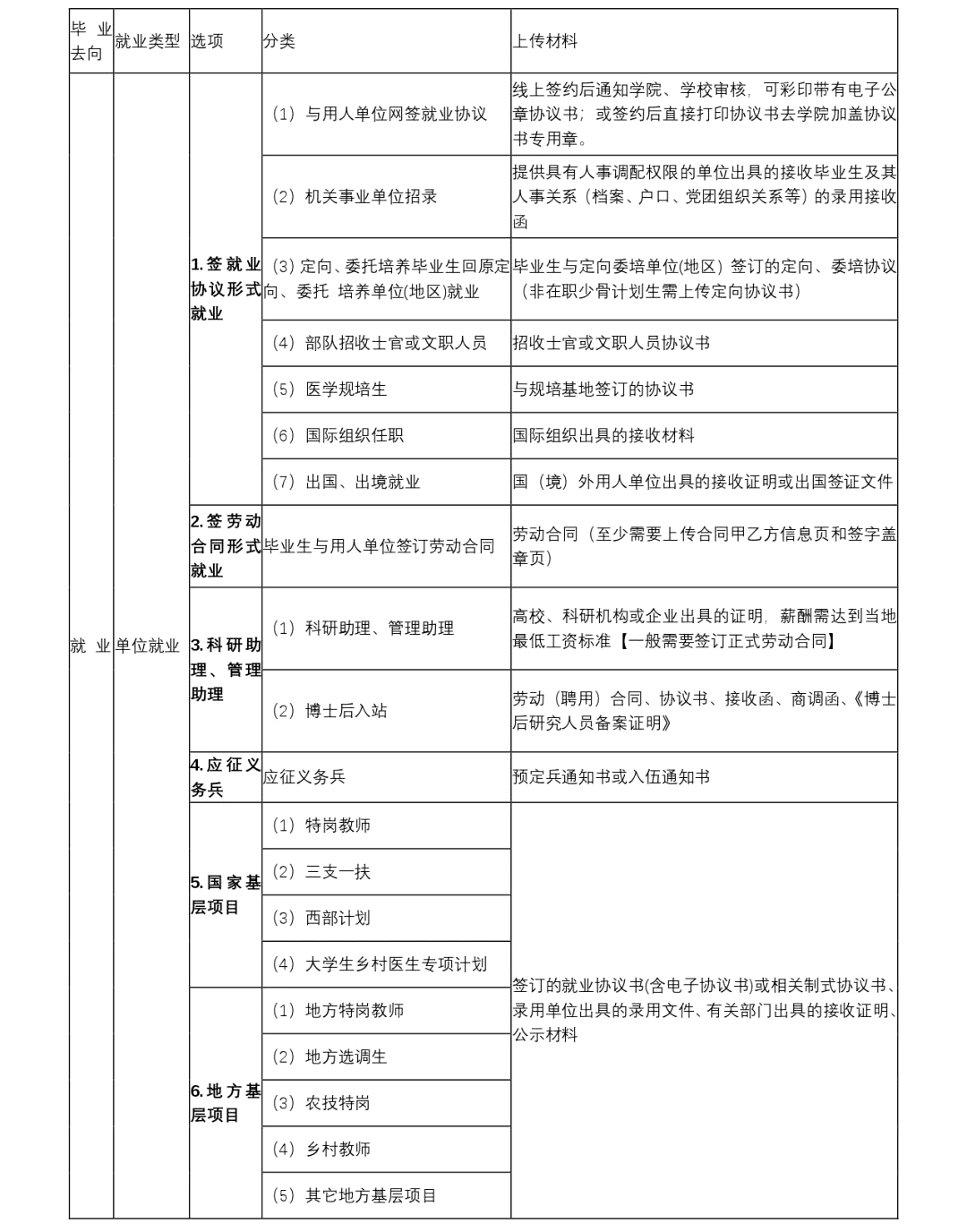 (3)除以上两种签约方式外的毕业生,请参考“毕业去向登记分类及界定”中所需的上传材料,交于辅导员并告知毕业档案去向,由辅导员录入就业方案完成毕业去向登记。